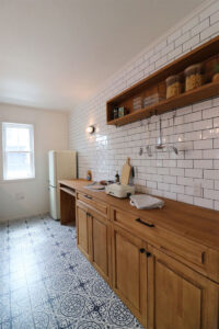 ウィリアムモリスの壁紙もさりげなく配して、粋な造作の数々。