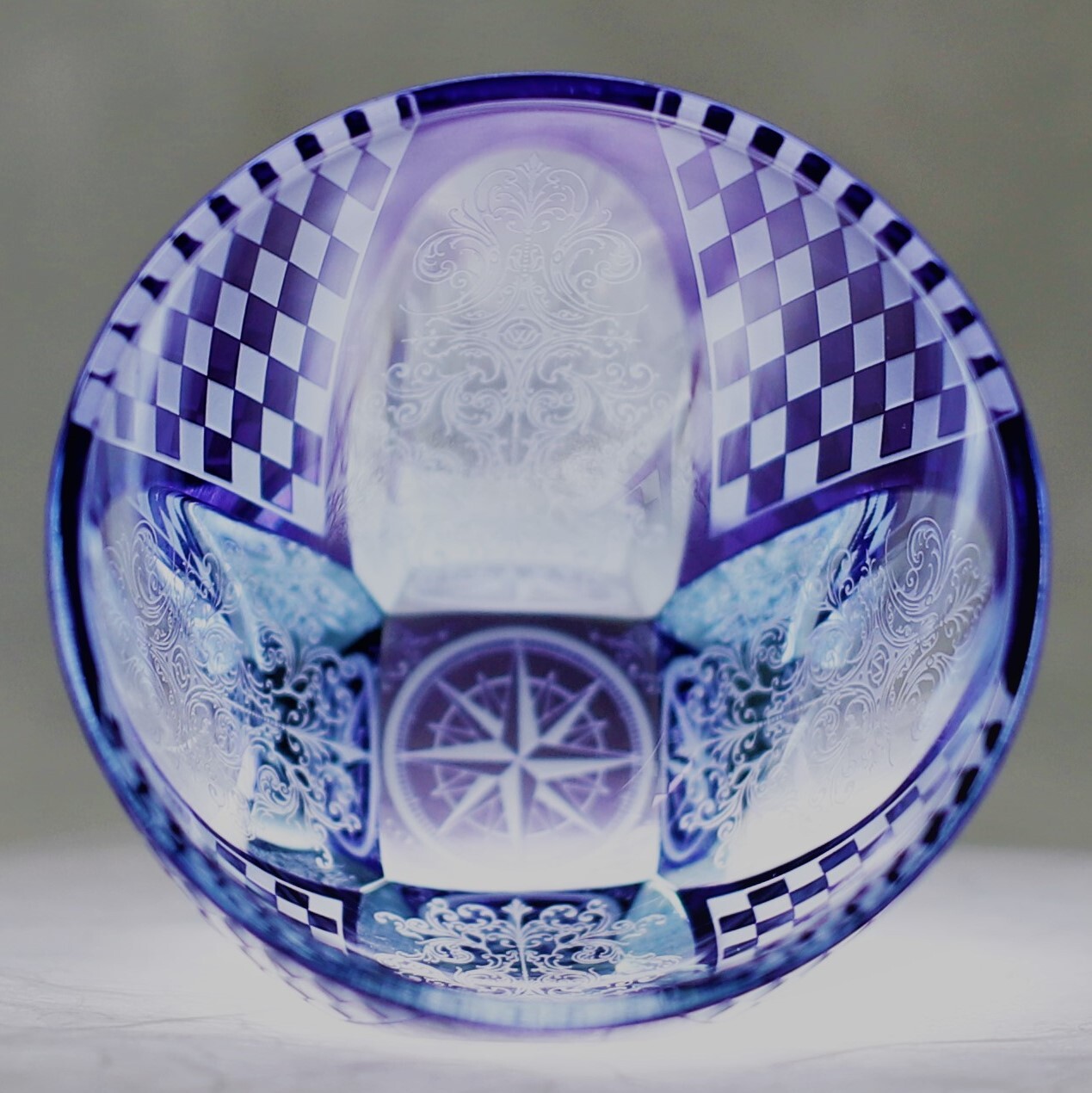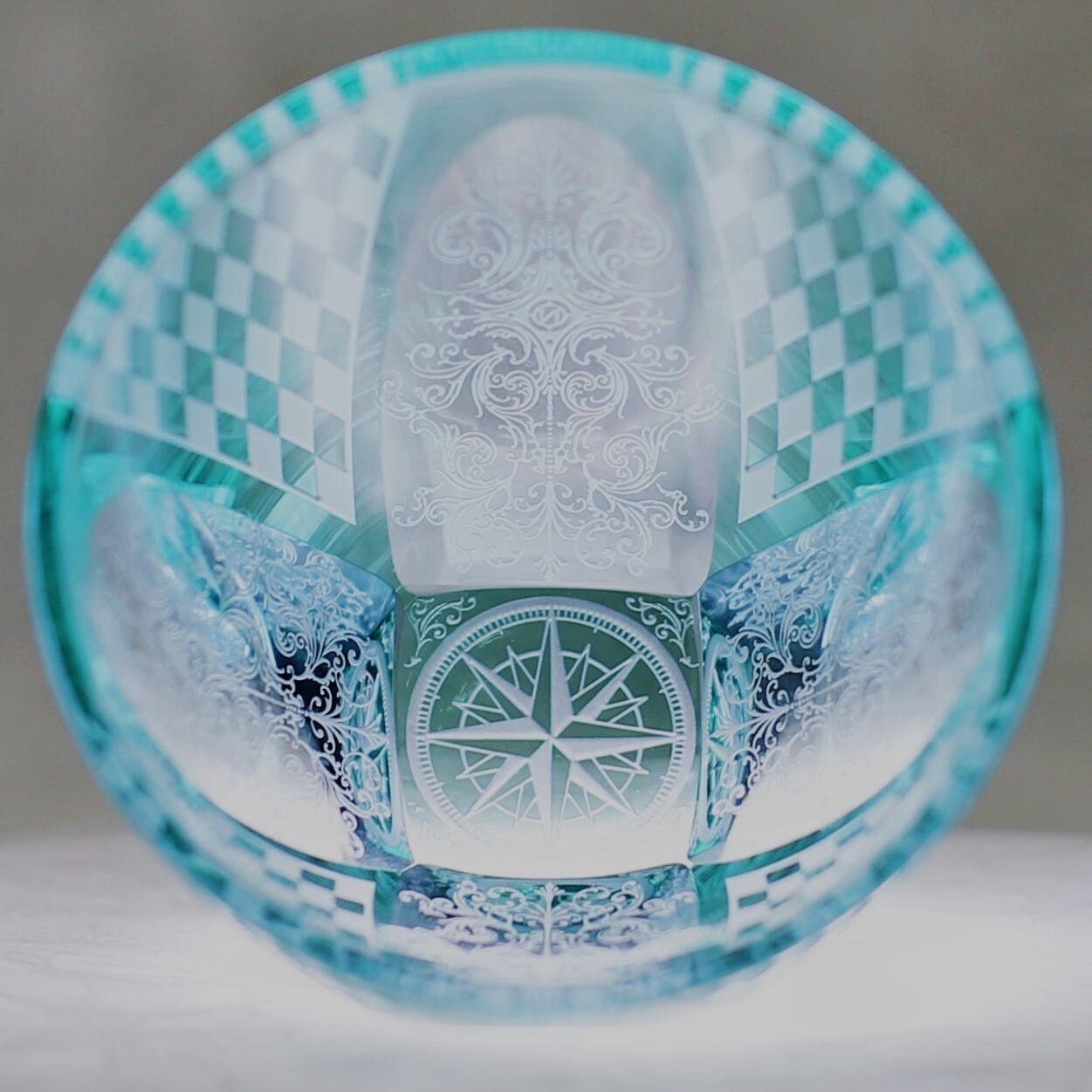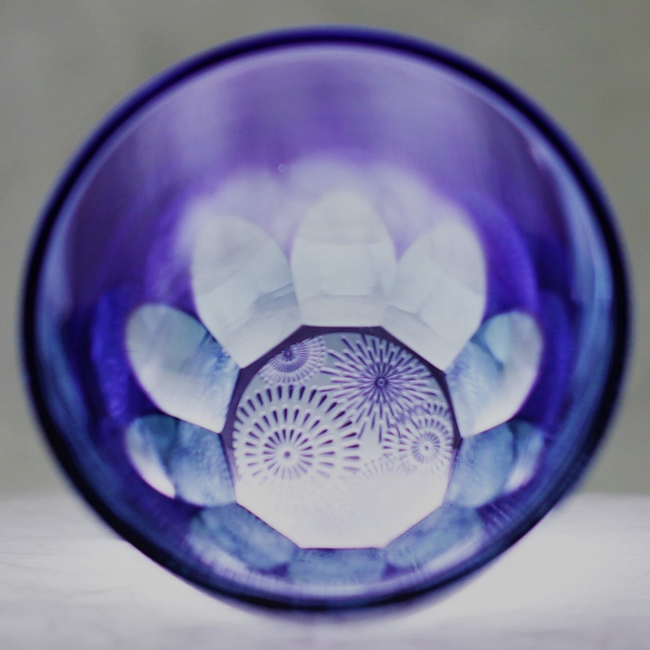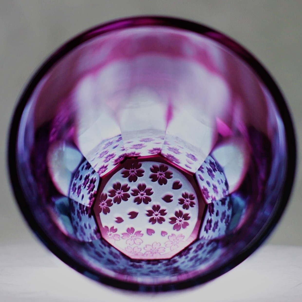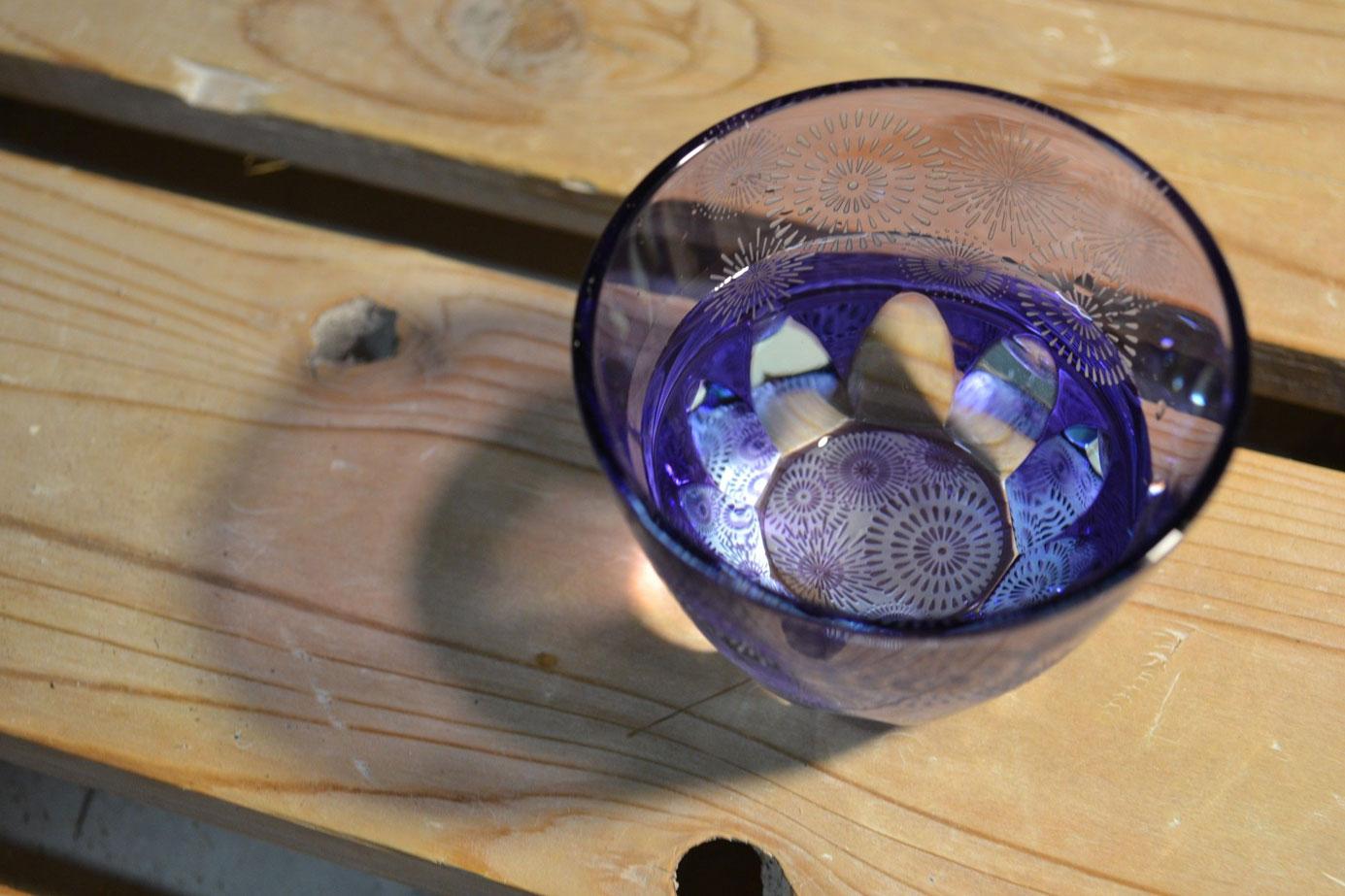 お酒を注ぐと底の模様が側面に映り込む事象を利用した切子で、お酒好きの方を驚かせる江戸切子として、大きな反響と評価を得ている。