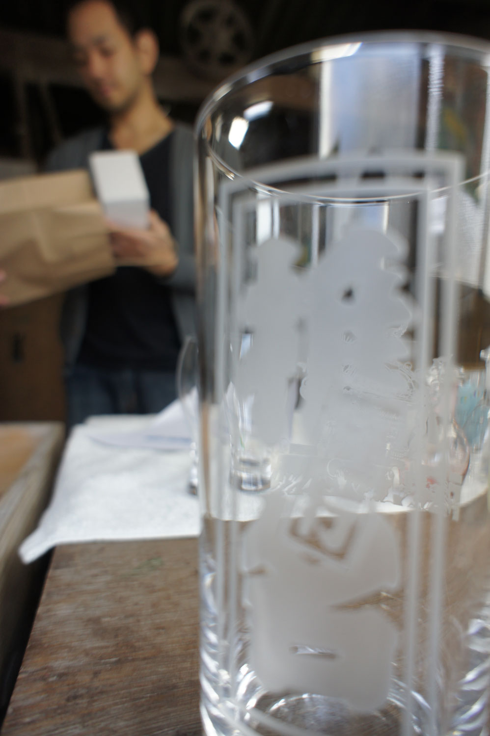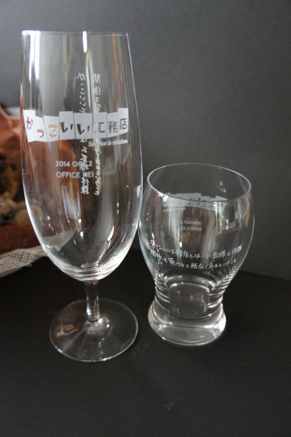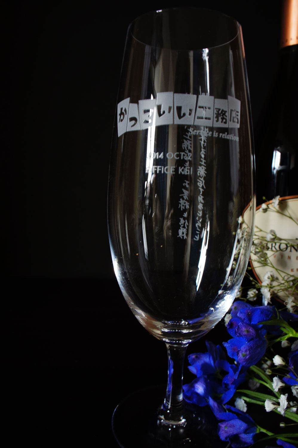 椎名硝子では、企業が表彰時に使うトロフィにロゴや名前の彫刻を行っており、その機能を使った完全オリジナルのグラスを恩師のために作った。