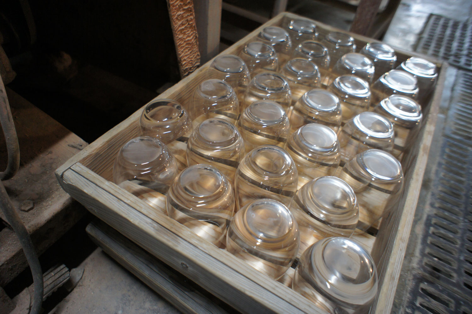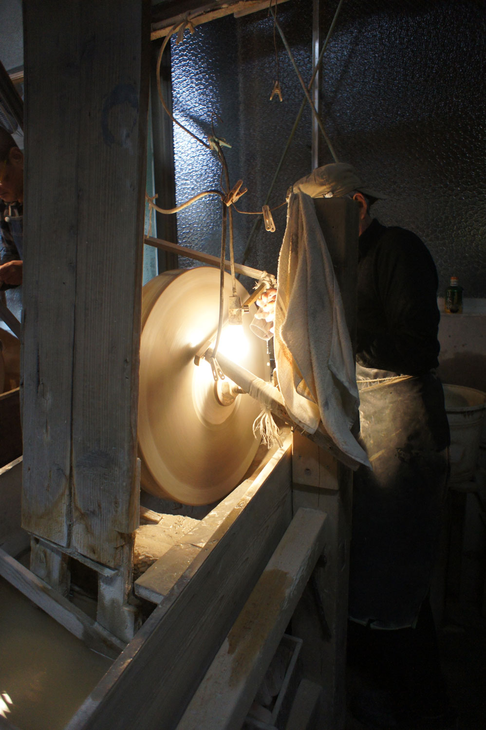 創業当時と変わらない旧式の研磨機が現役で稼働している貴重な工場、㈲椎名硝子で製作を行っている。