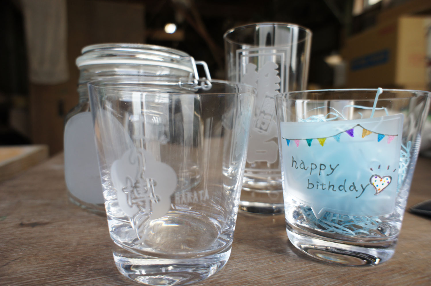 椎名硝子で加工するグラスに、大切な人への思いを込めたメッセージを刻む。お誕生日、結婚祝い、記念日、出産祝い、退職される方への気持ち、父母への感謝の言葉など、人の数だけストーリーと想いはさまざま。