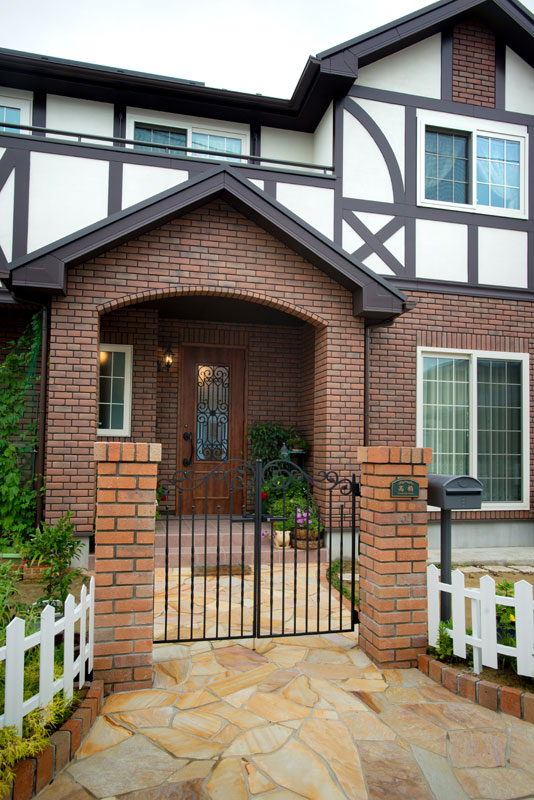 イギリスの15~17世紀にかけての建築様式「チューダースタイル」。1階の外壁はレンガタイル、2階は塗り壁の表面に直線や曲線の模様を描くティンバーが印象的な佇まい。