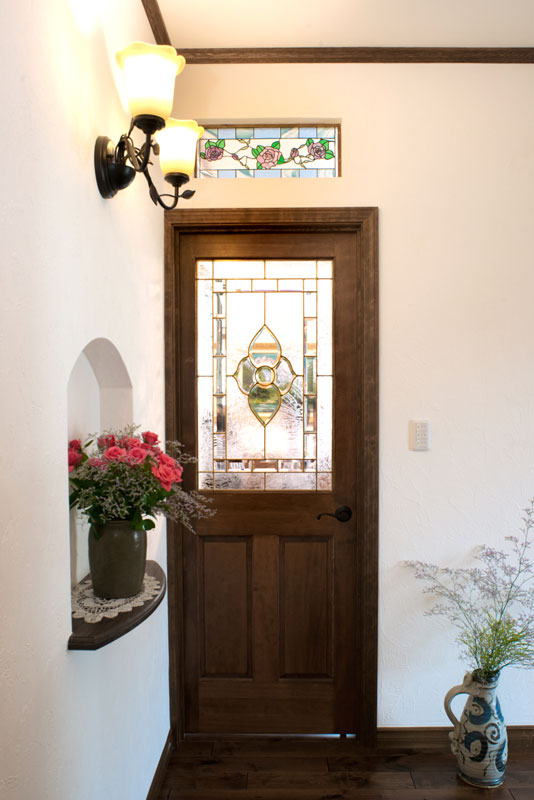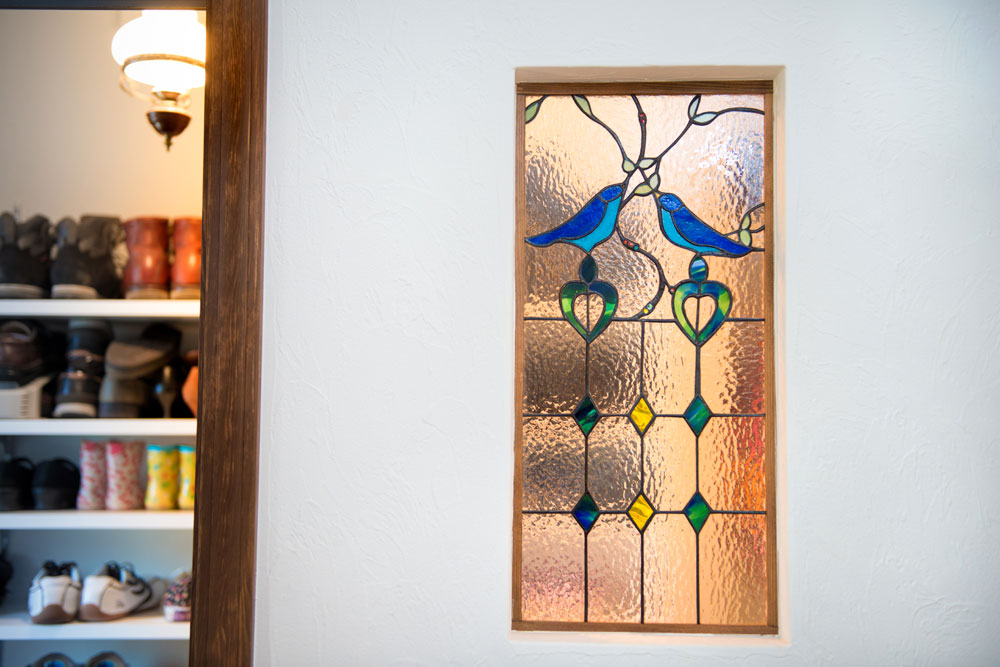 青い鳥が印象的なステンドグラスは、奥様とお嬢様の大切な思い出が込められている。左のシューズクロークは、動線に配慮し、そのまま廊下に繋がる。