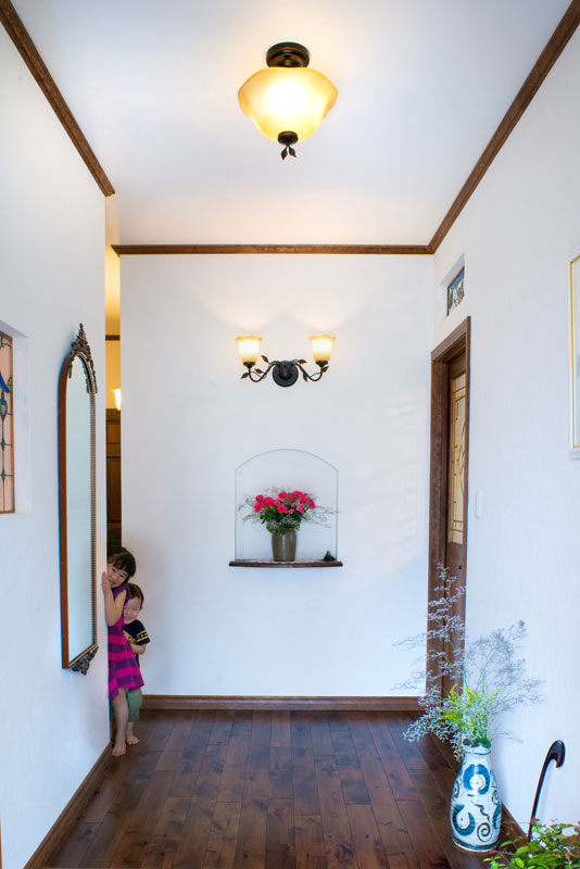 アンティーク調の玄関ドアを開けると、正面のニッチに飾られた奥様のフラワーアレンジメントが出迎えてくれる。