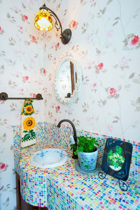 アンティークな手洗いボウルを彩るカラフルなタイルはお孫さんのセレクト。洗面所やバス、トイレなどの水廻りは、回遊式の廊下に添って配置、動線もスムーズ。