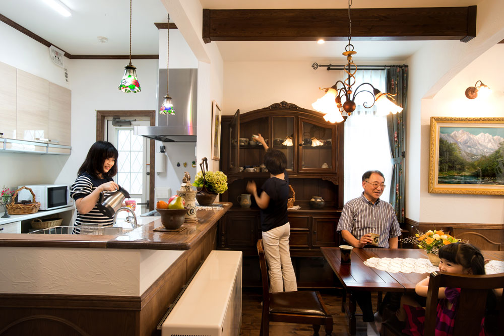 家族と話しながらお茶の準備ができるキッチン。ダイニングの食器棚には、ご夫婦が一つひとつ選んで集めたカップが並ぶ。