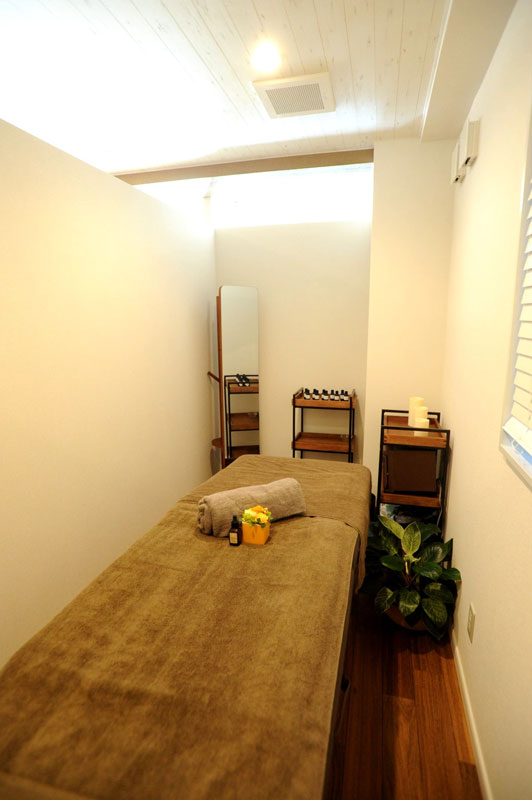 床全面に無垢フローリング(kuku 原産地インドネシア)を乱尺張りにし、OSUMO自然塗料で仕上げ、ナチュラル感のあるハワイアンリゾートコテージ風に仕上げている。