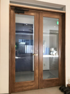 天井にはシーリングファンを設置。エントランスドアは無垢の両開き戸をご提案。