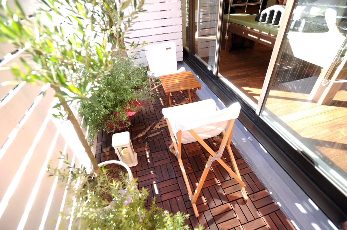 窓から見えるベランダにもデッキとフェンスをあしらい南国情緒を演出。