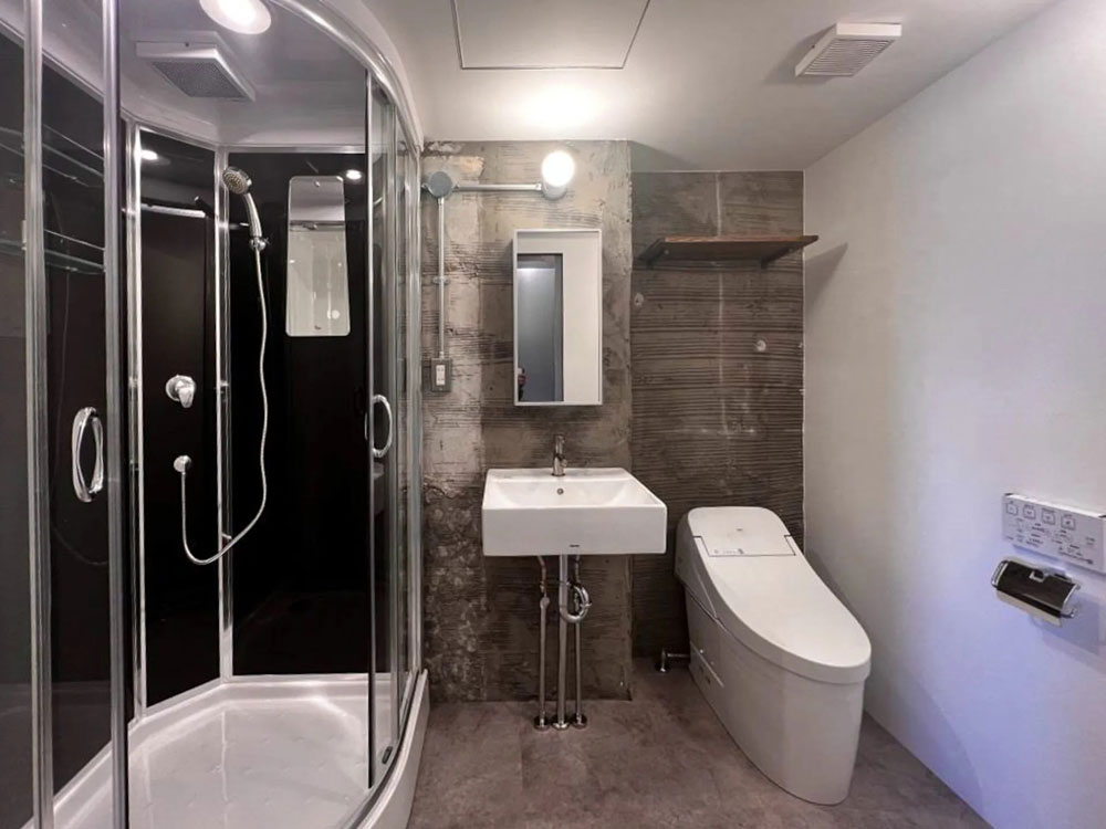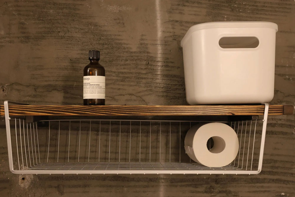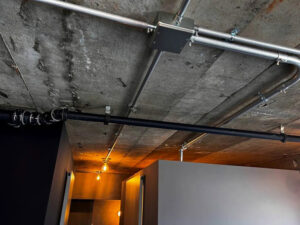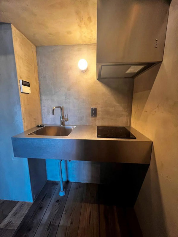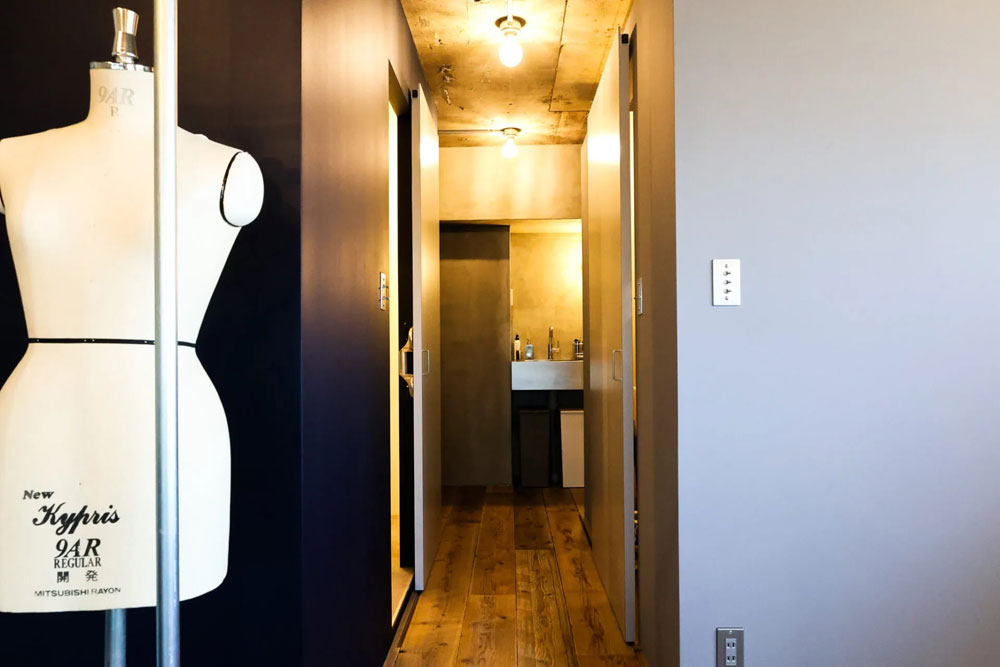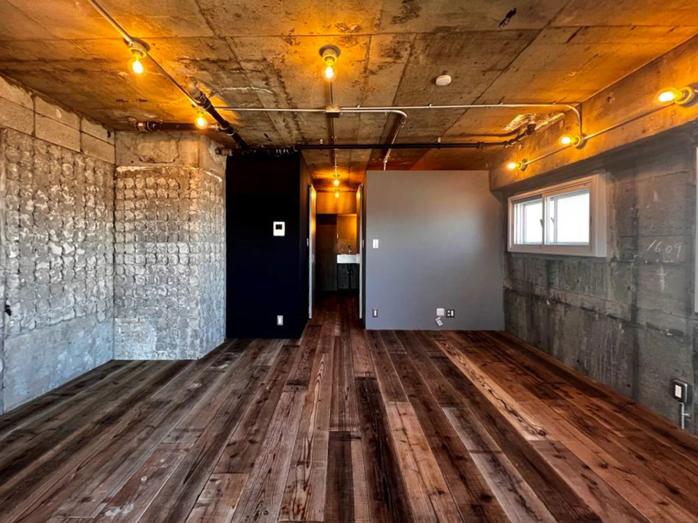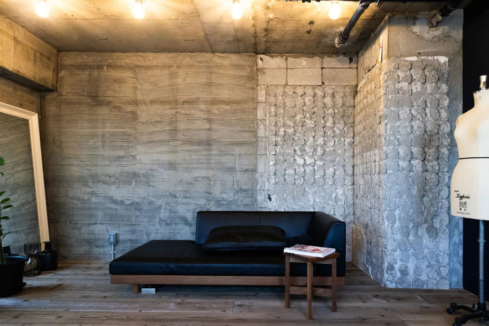 壁面に施したデザインコンクリートの演出が、インダストリアルな雰囲気の室内空間を生み出している。