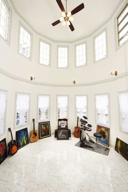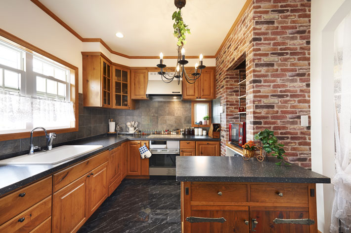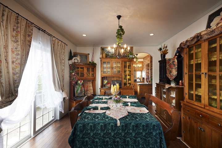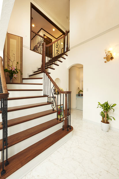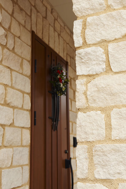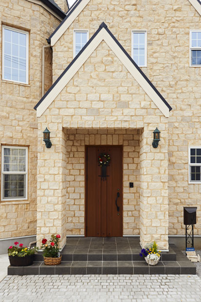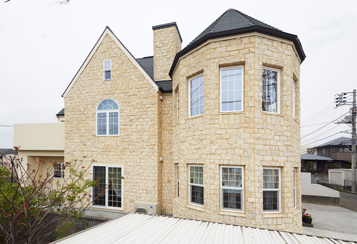外壁にはイギリスから取り寄せたコッツウォルズの石を貼り、外観、インテリアともデザインと素材にこだわりぬいた本格的な輸入住宅。
