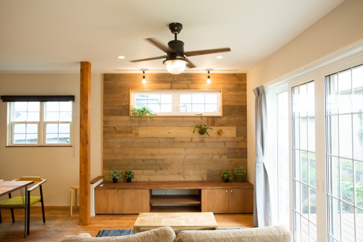大工さん造作によるオリジナルテレビ台と、壁にアクセントで足場板を張ったテレビコーナー。釘や画鋲が自由に刺せる足場板はデザイン性も高く便利。