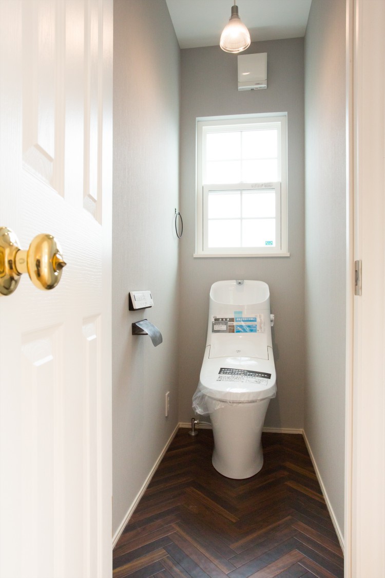 ヘリンボーン調のクッションフロアにグレーの壁紙がマッチしたカッコ良いトイレ。