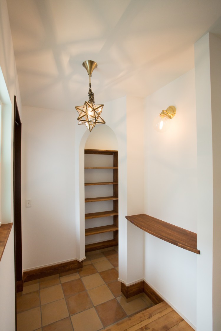ゴミ箱置場やブラケット棚などオーナーと念入りな打合せを重ねた造作。カウンターを食器棚にセミ造作。アーチの奥はパントリー。