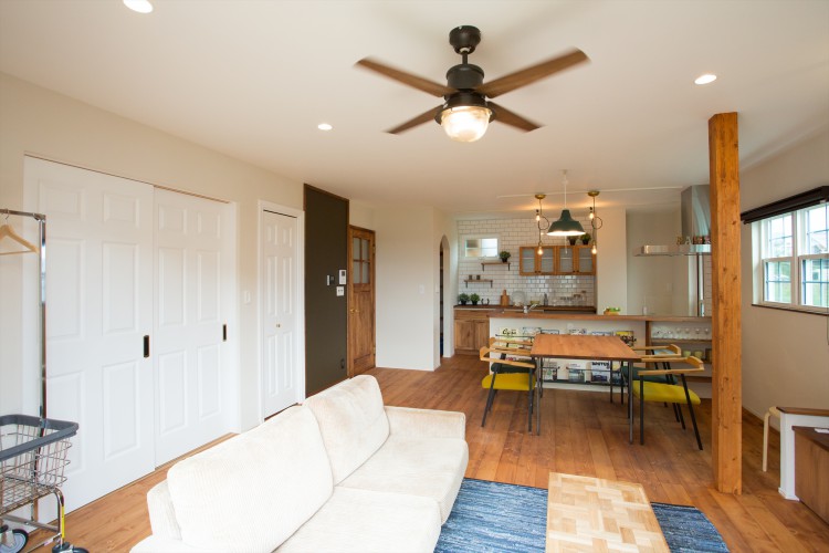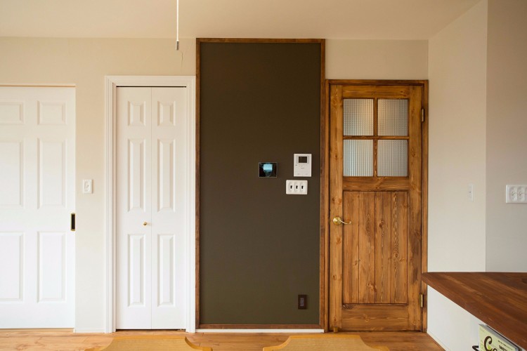 家族のコミュニケーションを助けるチョークボードは、壁一面を使ってLDKの中心に。