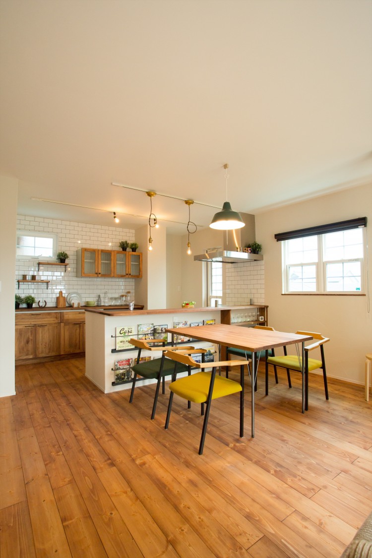 明るい光が入るダイニング。キッチンカウンターにはアイアンマガジンラックや可動棚を造作。