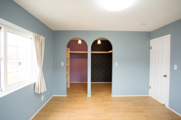 入り口のアーチが絵になる主寝室のウォークインクローゼット。ご夫婦それぞれにスペースを確保した。