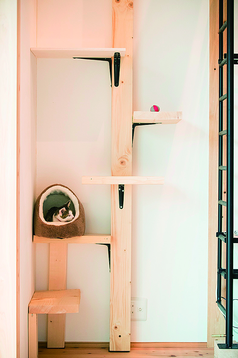 室内全体にも無垢の木を施し、スチール製の棚を随所に配置している。