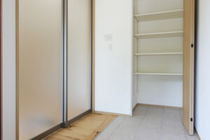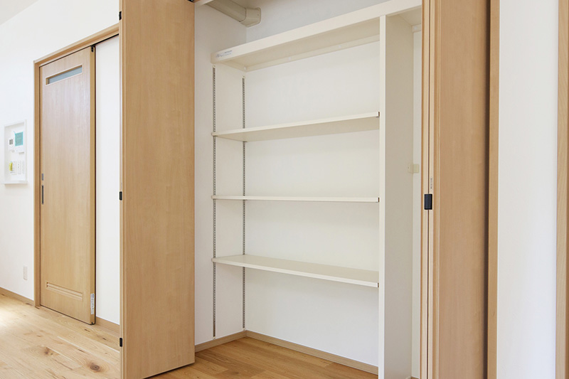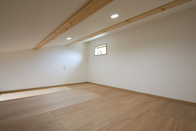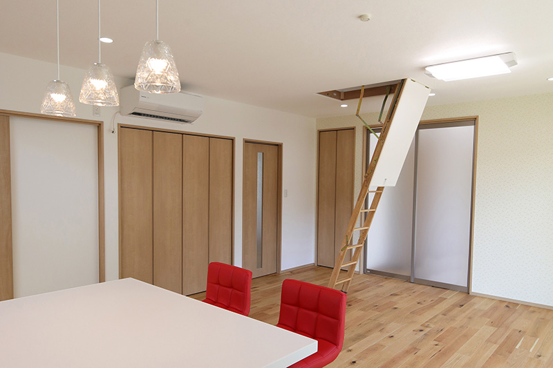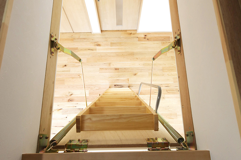 収納スペースも随所に施し、リビングの上には屋根裏収納も施工。