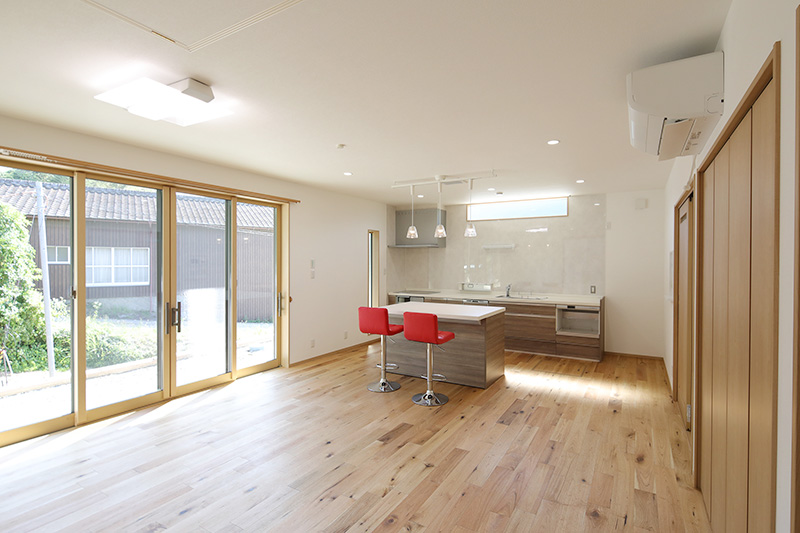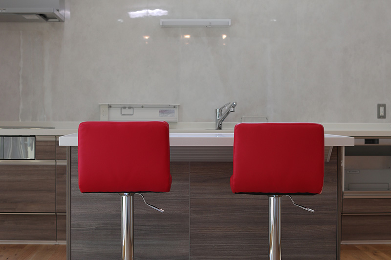 アイランドキッチンのカウンタチェアーの赤色が室内に彩りを添えて。