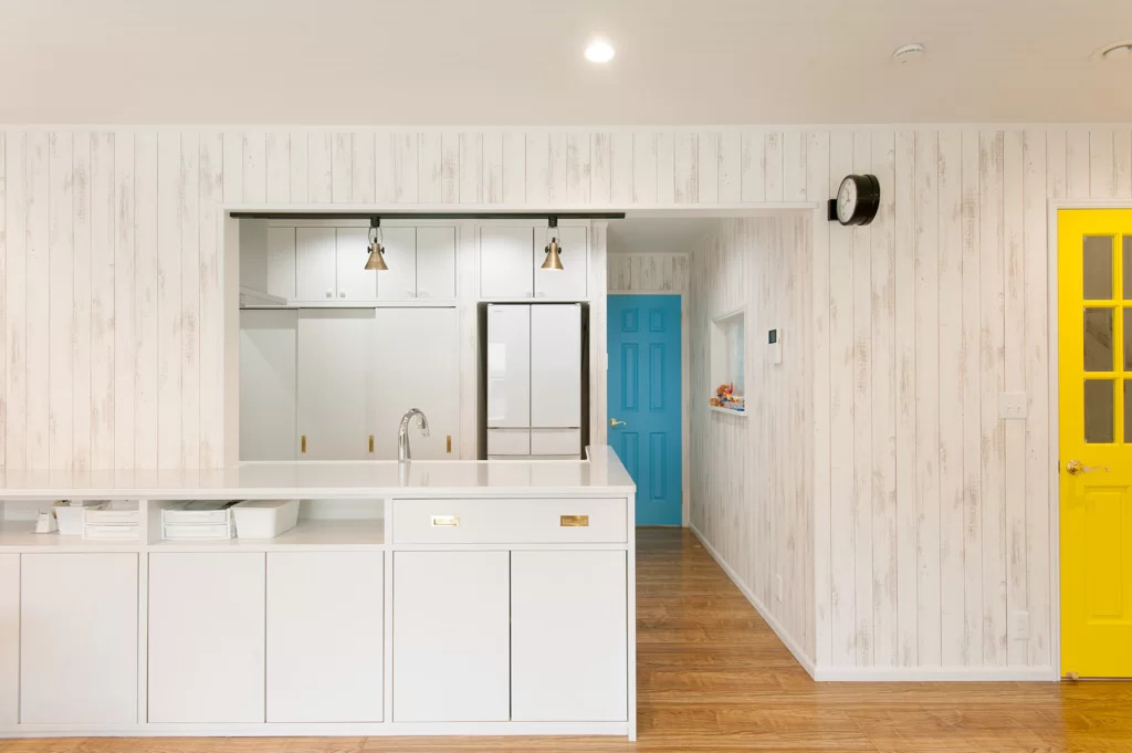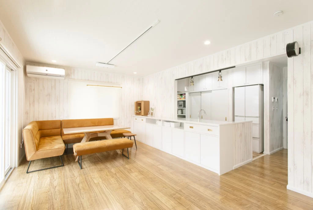 白い木目の壁紙が空間を調和させる1階のLDKは、家族みんなが気軽に集まる空間。