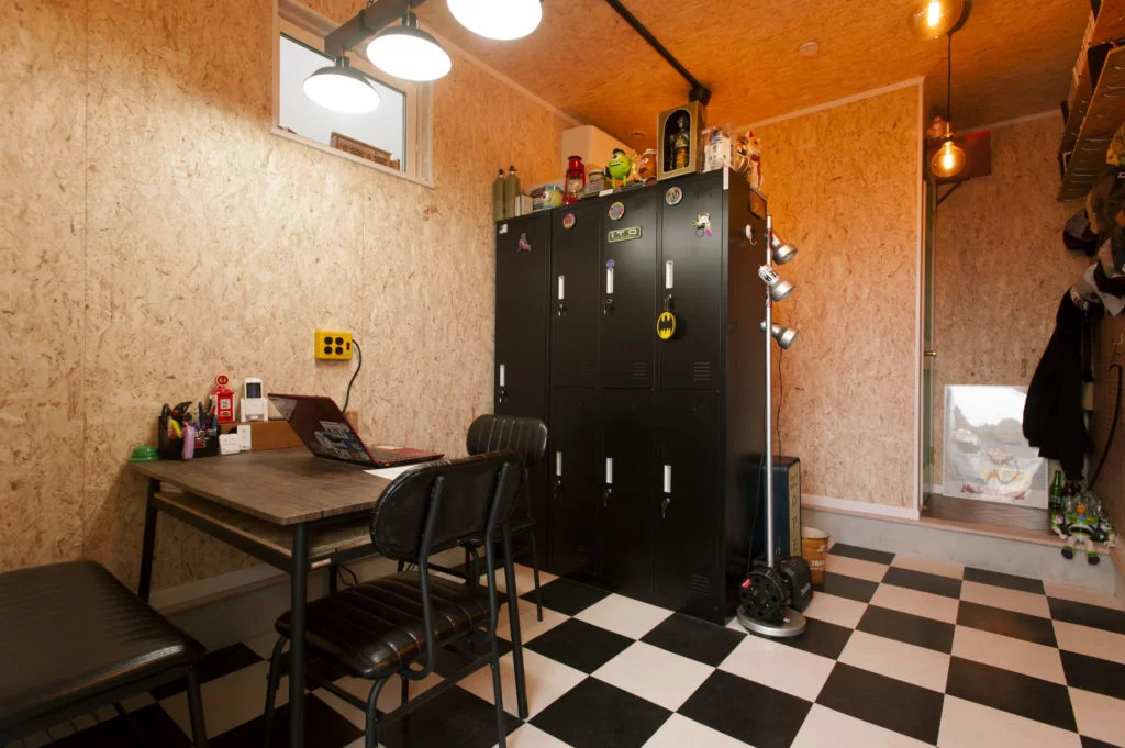 チェッカーフラッグ柄のアメリカンテイストでカジュアルな一室は事務所はご夫婦が使う事務所に。