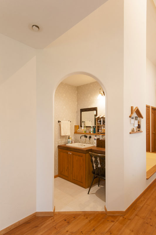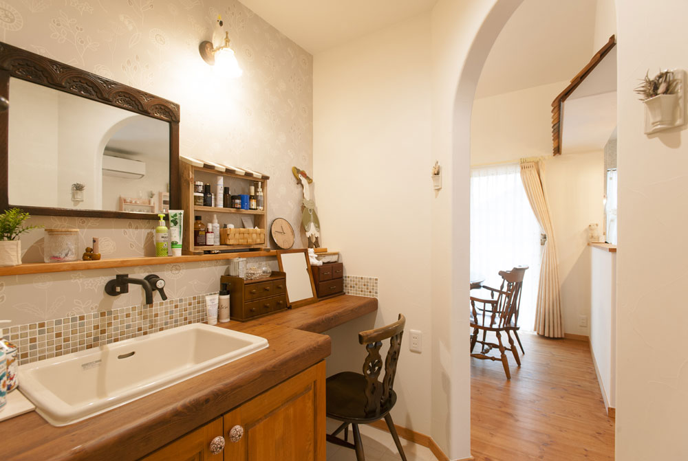 ハンドメイドの造作洗面台。横長の鏡やモザイクタイル、水栓、照明などこだわりが盛りだくさん。イスに座ってお化粧できるようにと夫人の要望も形に。