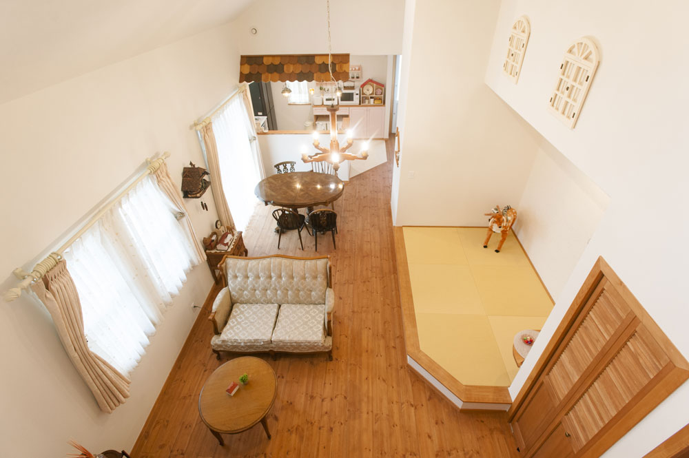 勾配天井で高さのある開放的な空間が実現できるのは、平屋ならでは。漆喰の塗り壁と自然塗料を塗った無垢床のコントラストが目を引く。
