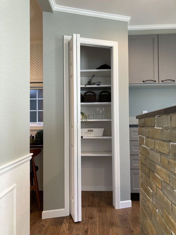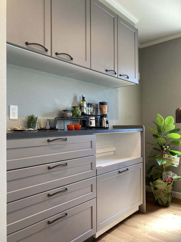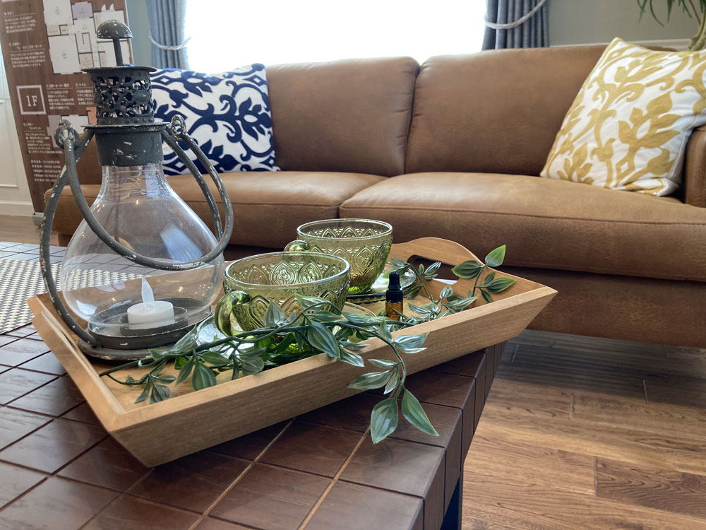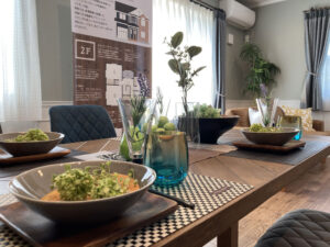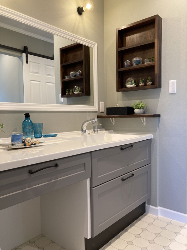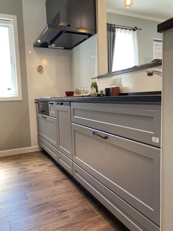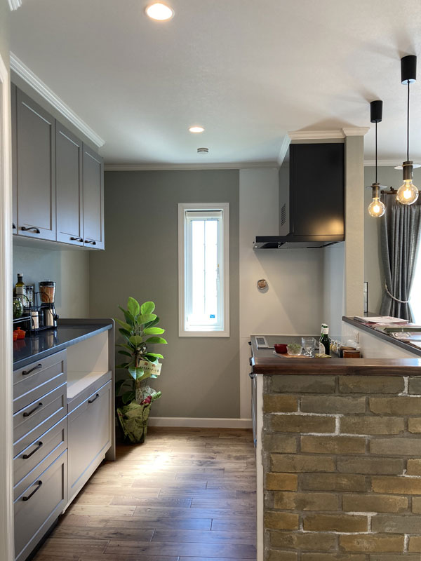 使いやすい回遊性のある間取りや、木製框組面材を採用したキッチン、洗面化粧台は個性的。