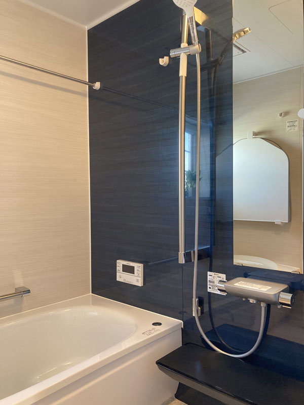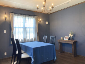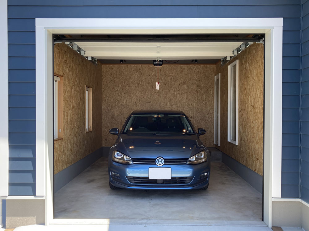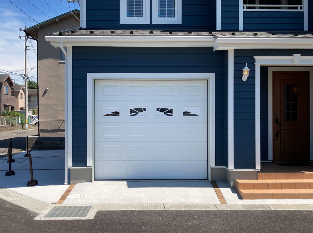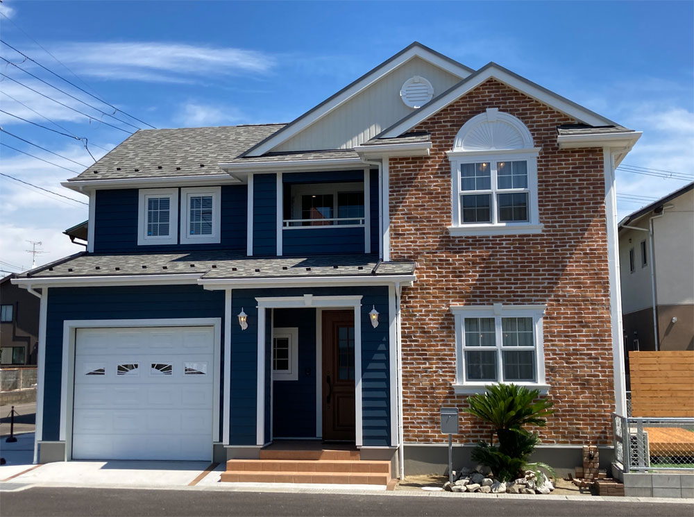 ミッドナイトブルーのラップサイディングが美しい、ビルトインガレージ付き、4LDKリアルサイズのアメリカンスタイル。
