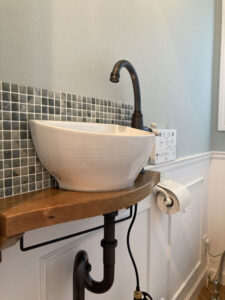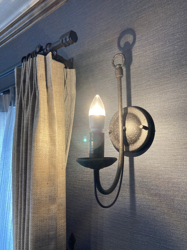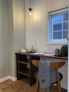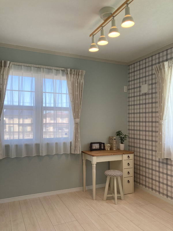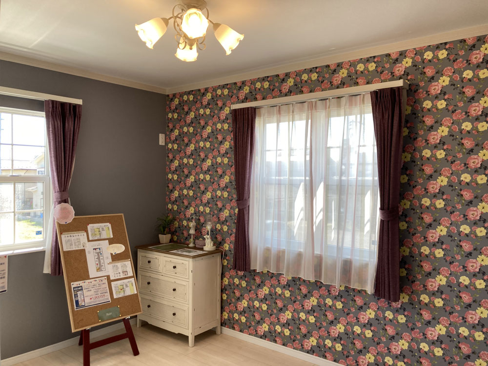 壁面の一角には、ウィリアムモリスのいちご泥棒の壁紙を配して、おしゃれな装い。
